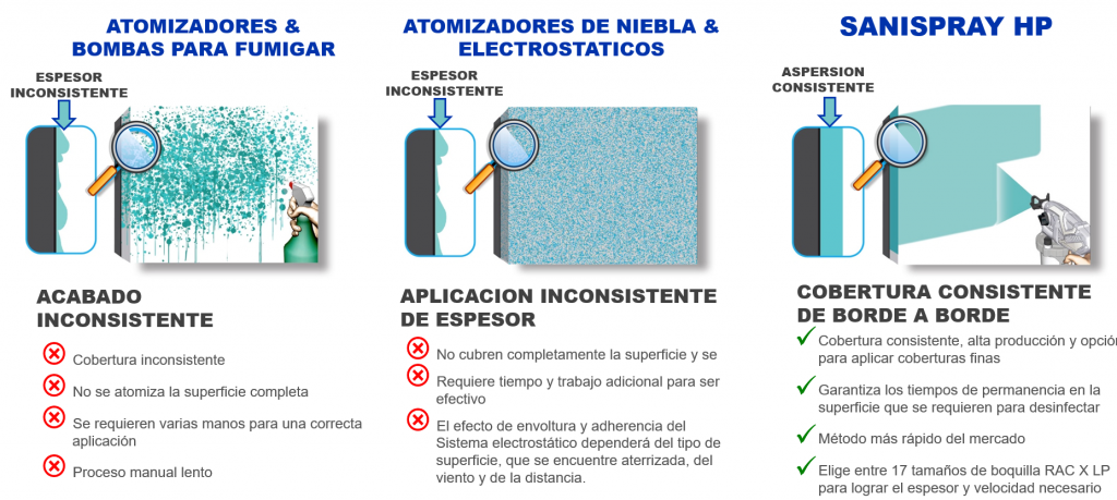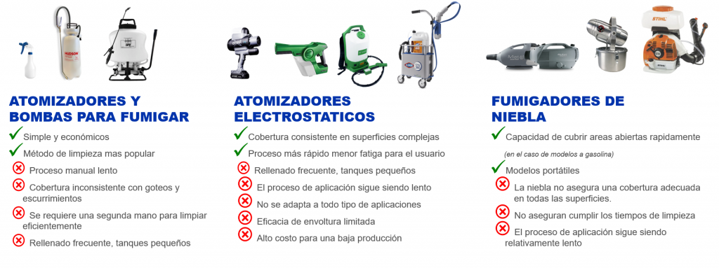 Los químicos son los que eliminan a los virus y bacterias no los equipos por lo que para combatirlos es indispensable una correcta aplicación y cobertura de los químicos que garantice los tiempos de permanencia de la solución para desinfectar y sanitizar eficientemente.